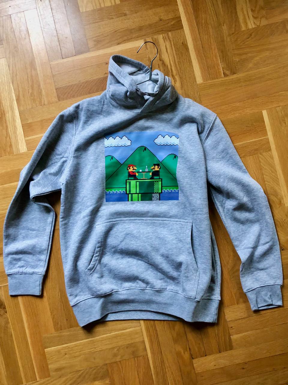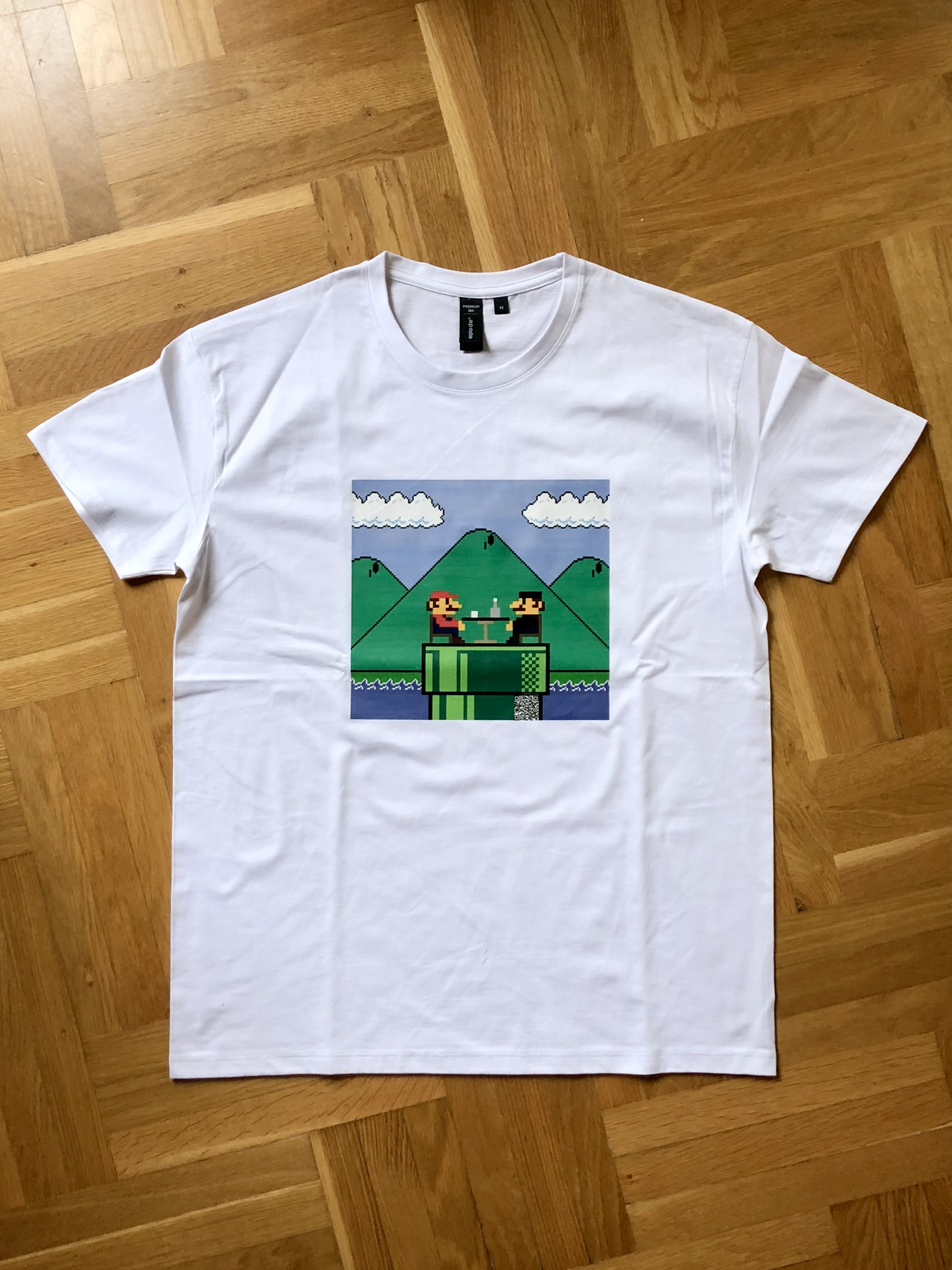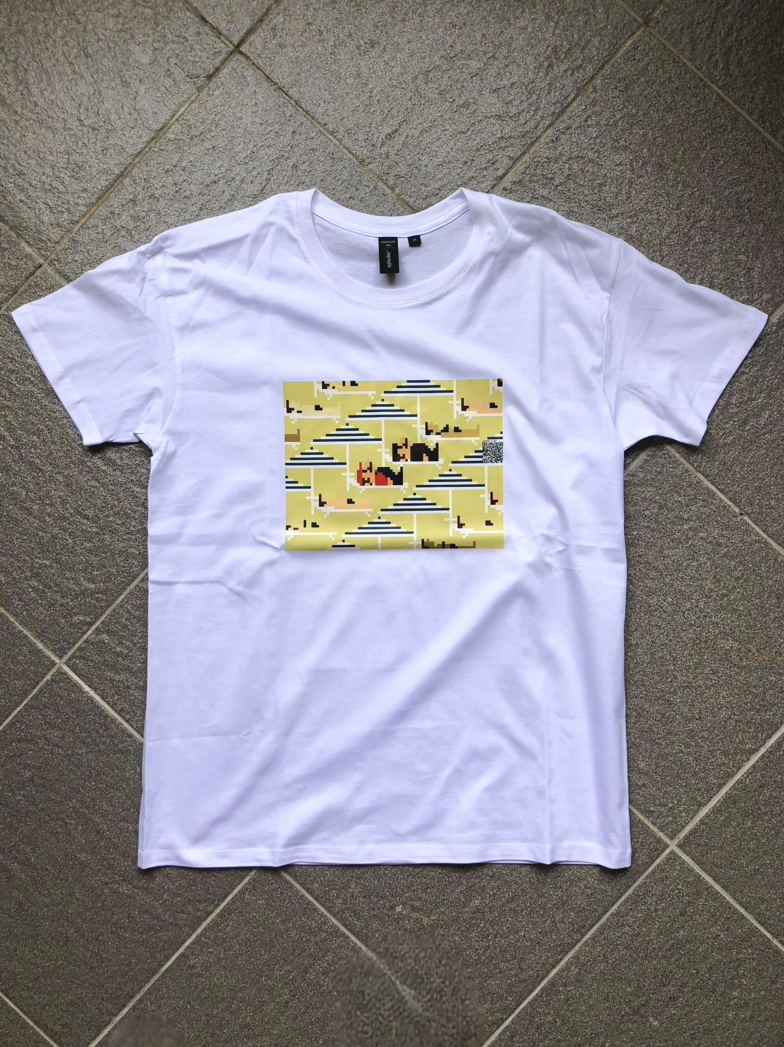 Pixel Art t-shirts, hoodies, tote bags have my prints on them with augmented reality effects that are activated with QR code through free EyeJack app on your phone. Available sizes L, M and S. Install free EyeJack app on your phone, scan QR code below to download animation, point your phone on artwork and have fun! You can also order my apparel directly from me or buy it in friendly shops.